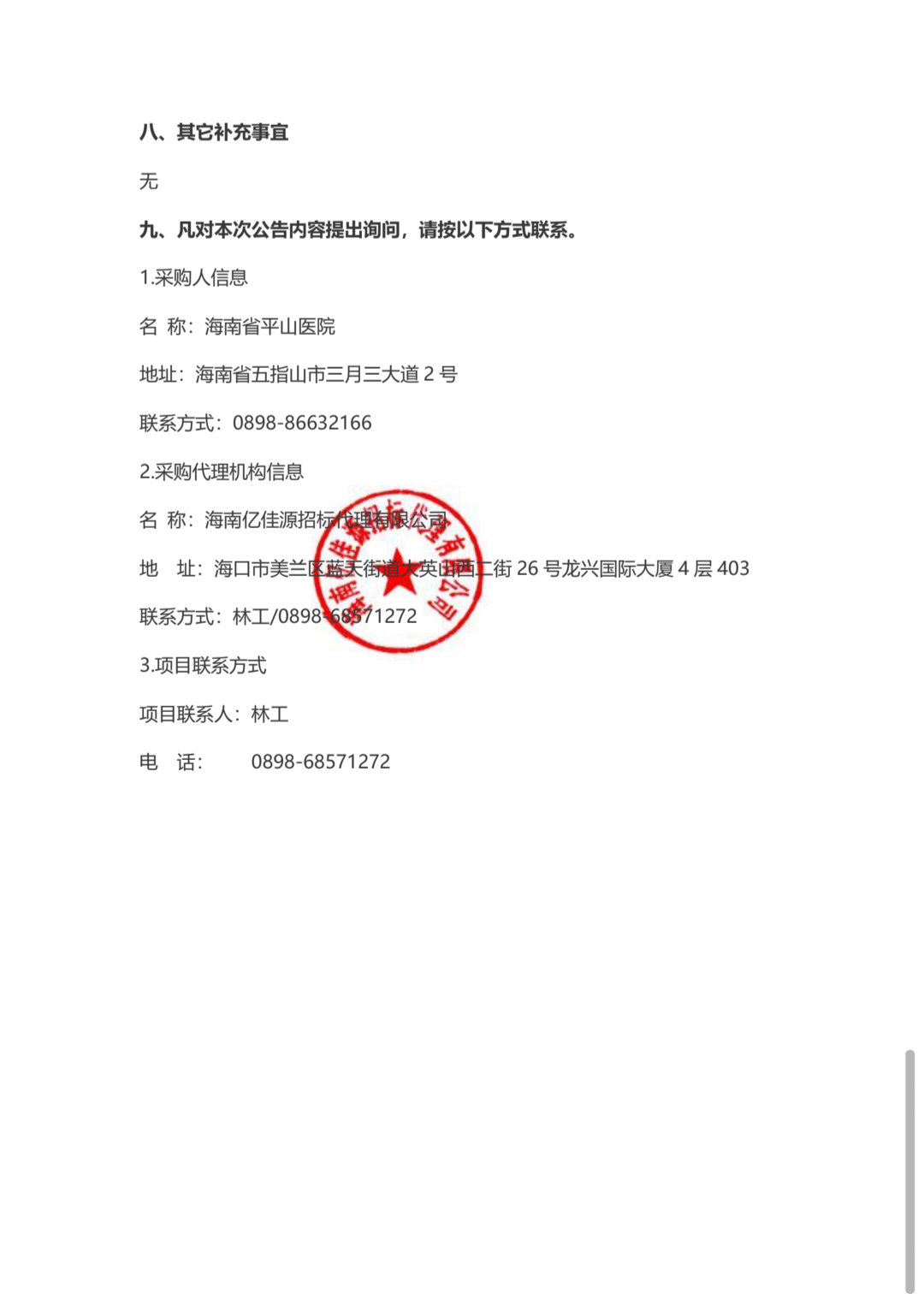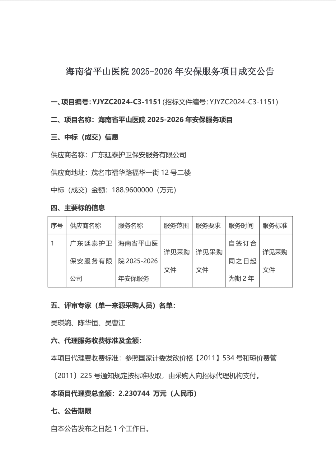 海南省平山医院2025-2026年度安保服务项目成交公告