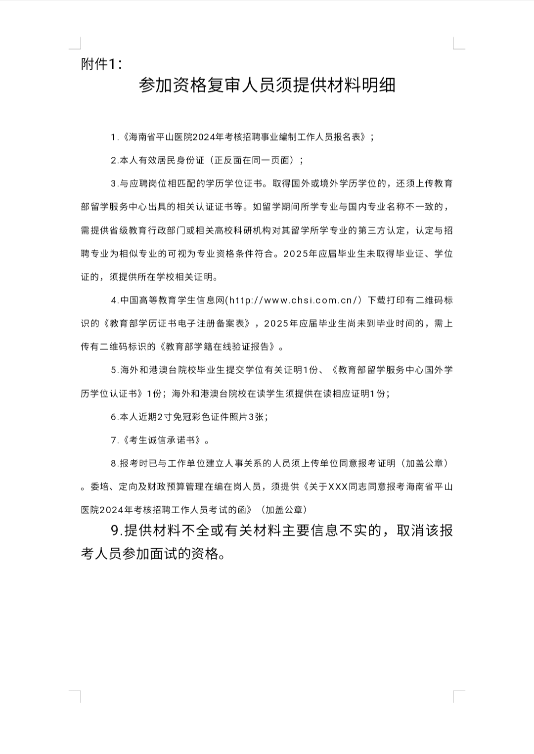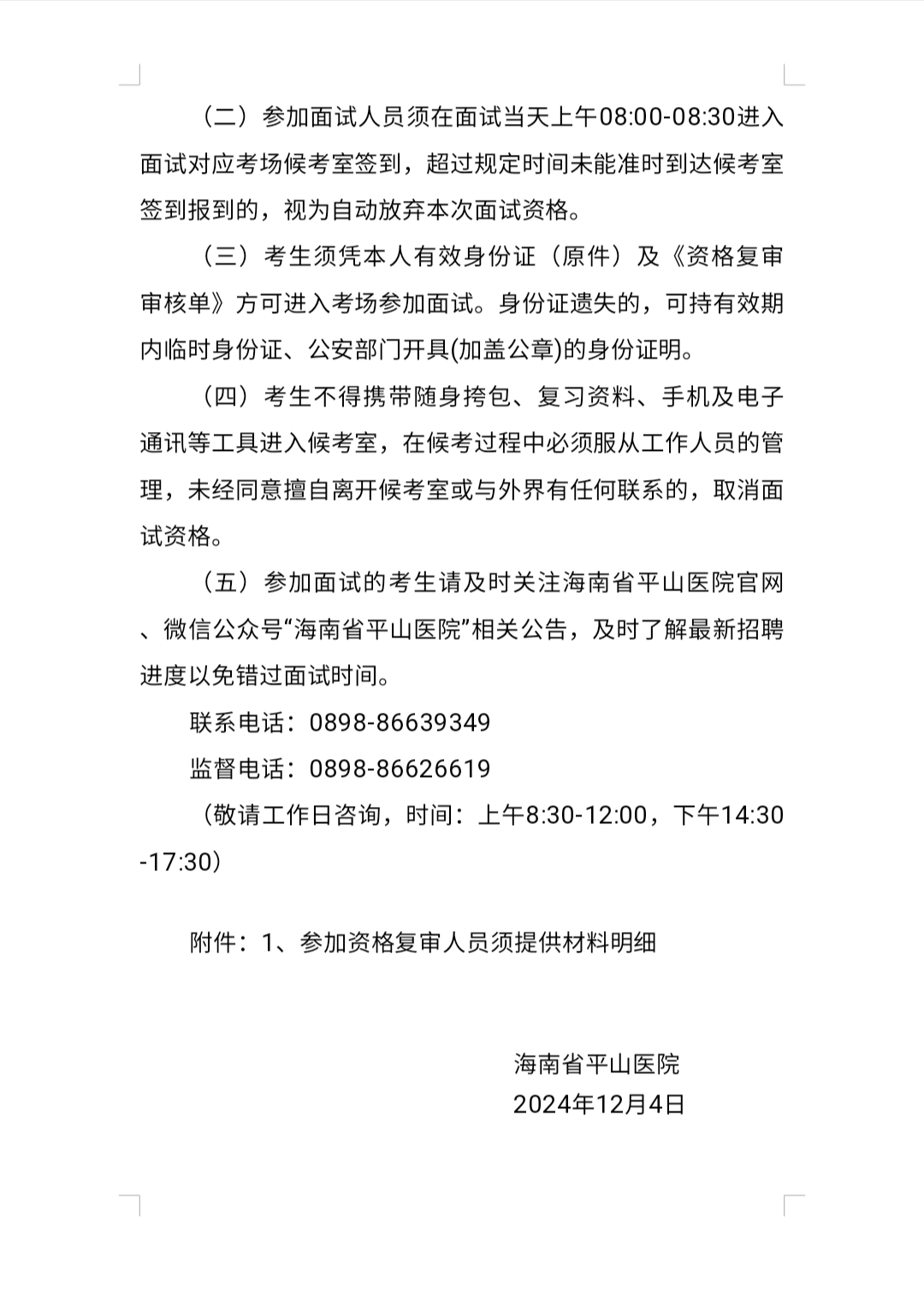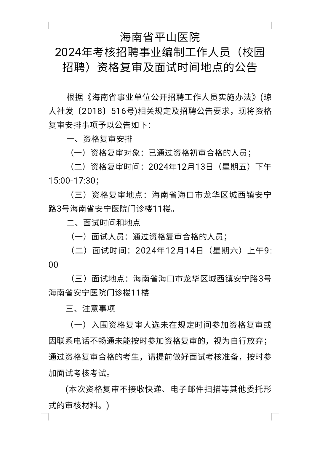 海南省平山医院 2024年考核招聘事业编制工作人员(校园 招聘)资格复审及面试时间地点的公告