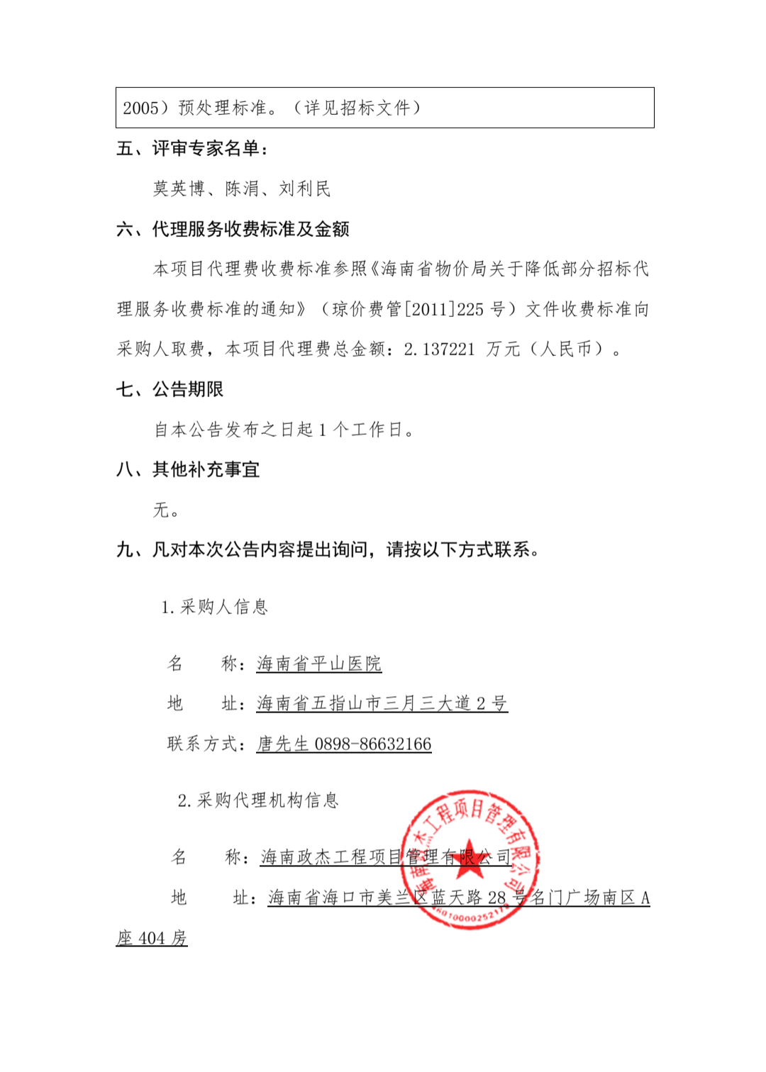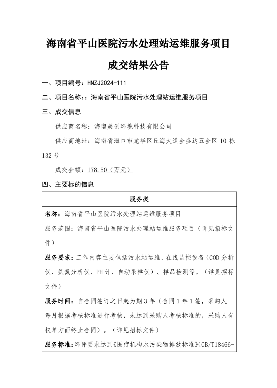 海南省平山医院污水处理站运维服务项目成交结果公告