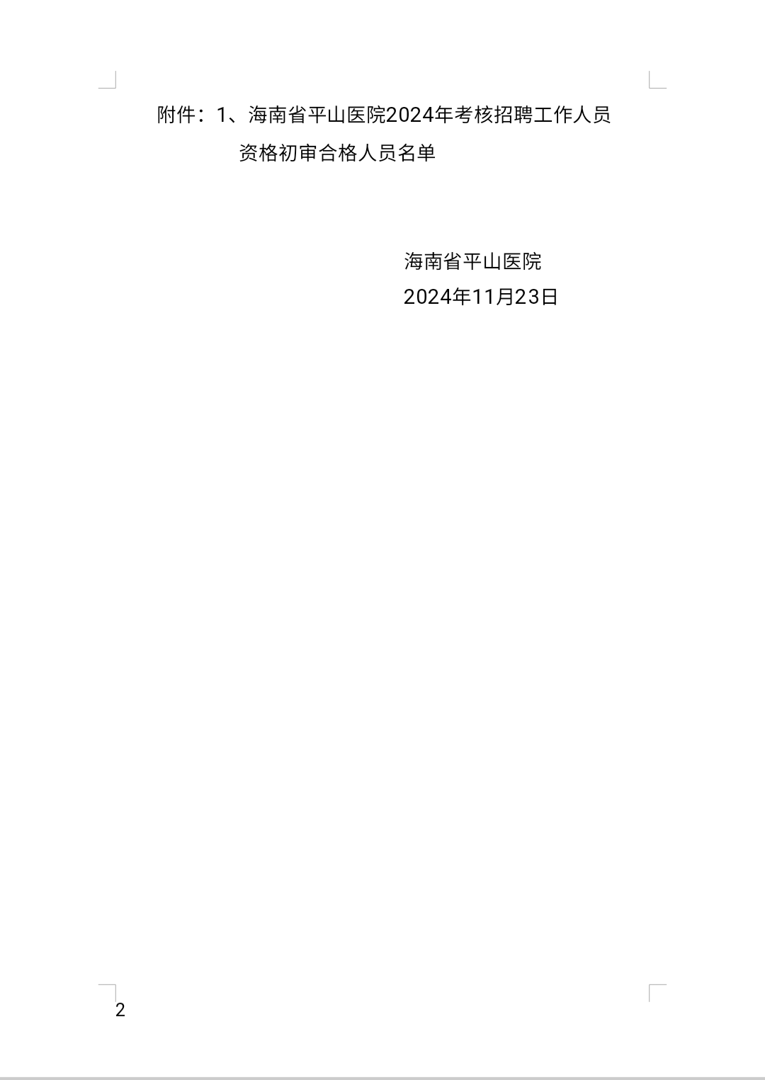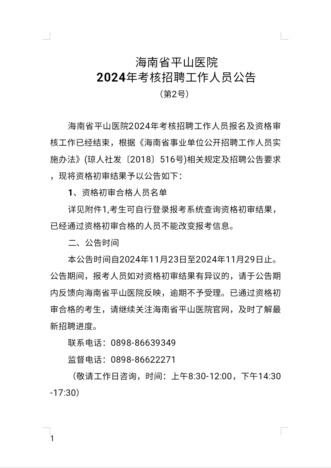 海南省平山医院2024年考核招聘工作人员公告(第2号)