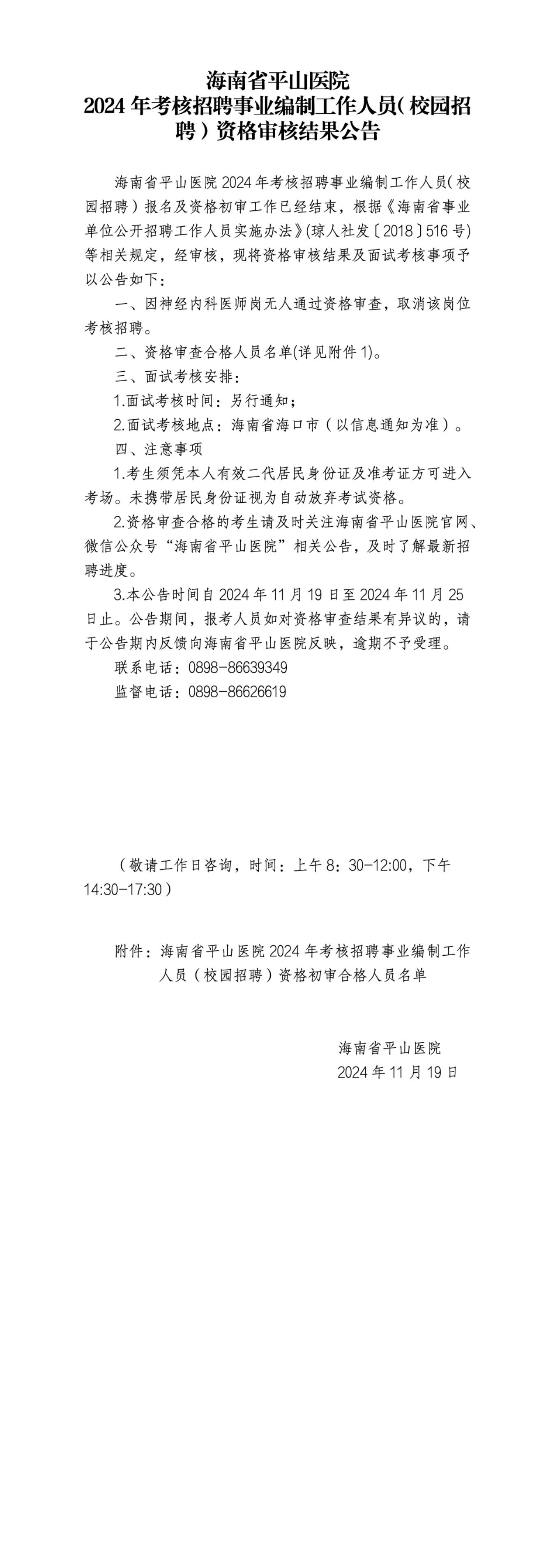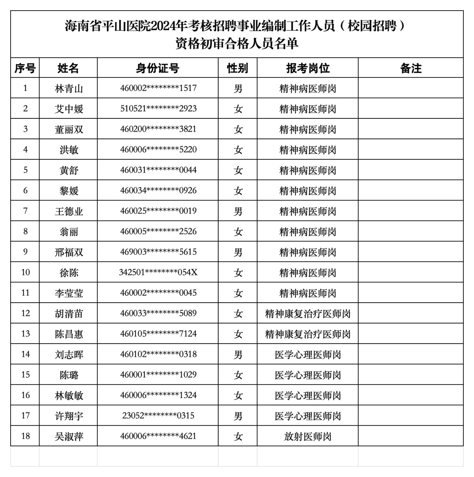 海南省平山医院2024年考核招聘事业编制工作人员(校园招聘)资格审核结果公告