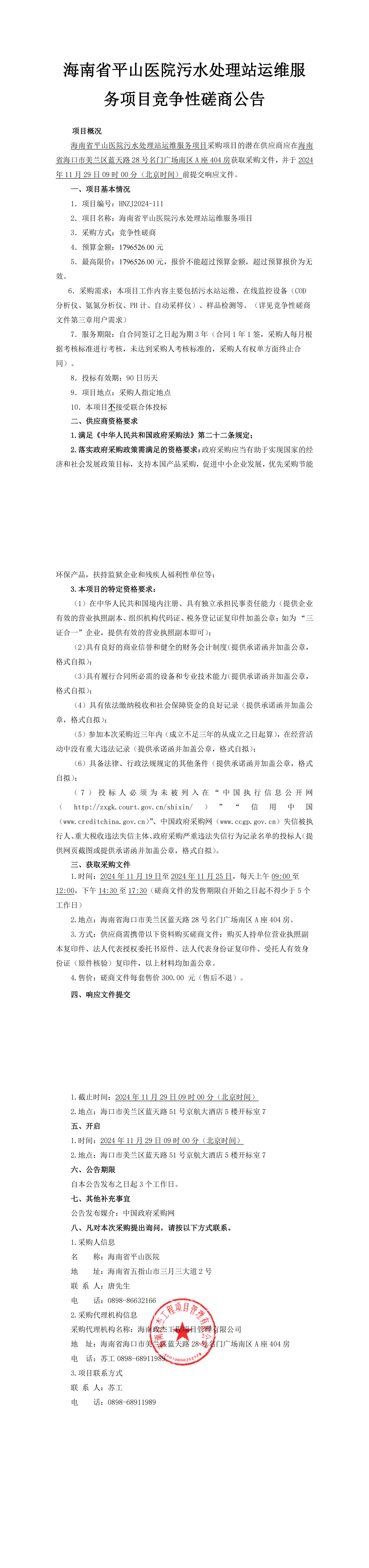 海南省平山医院污水处理站运维服务项目竞争性磋商公告