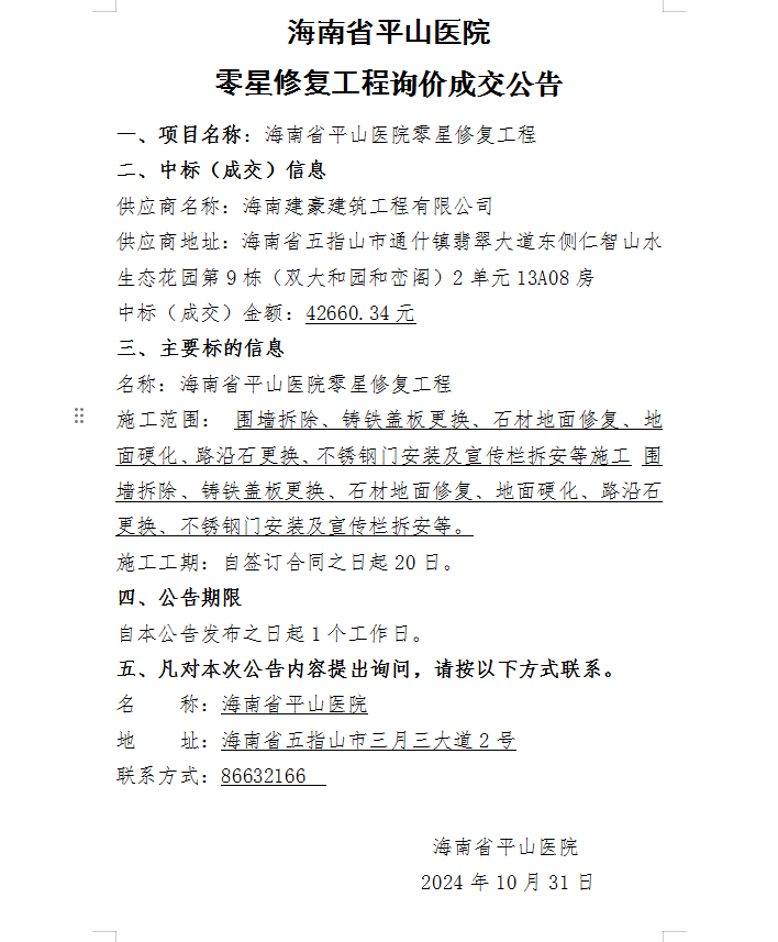 海南省平山医院 零星修复工程询价成交公告