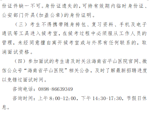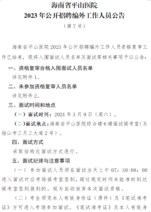 附件1:海南省平山医院2023年公开招聘编外工作人员资格复审合格入围面试人员名单 附件2:海南省平山医院2023年公开招聘编外工作人员 未参加资格复审人员名单 文章导航 上一篇:海南省平山医院2024年编外考核招聘紧缺专业技术人员公告下一篇:海南省平山医院2023年公开招聘编外工作人员公告(第6号)