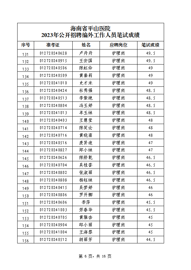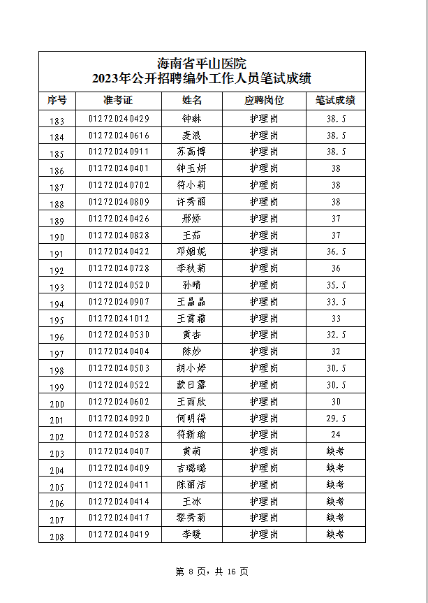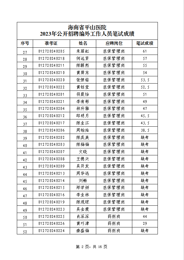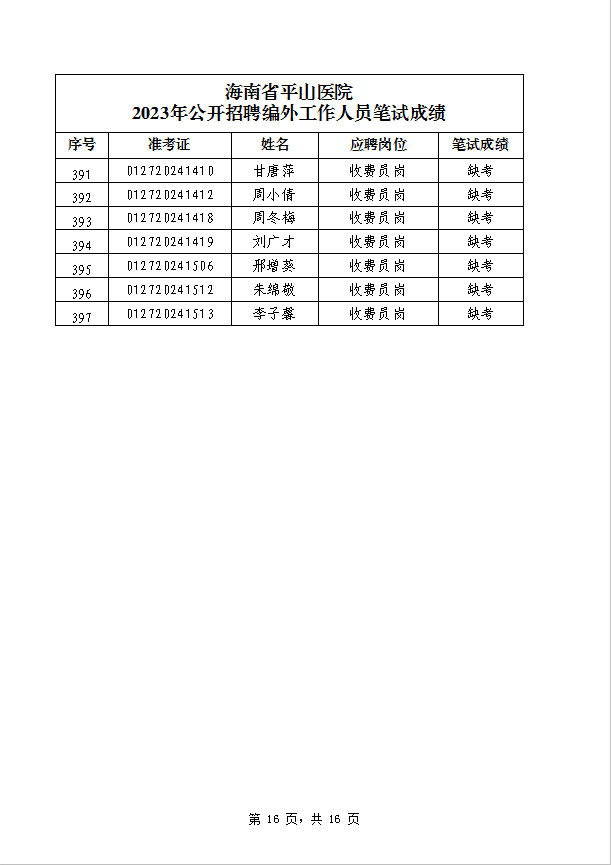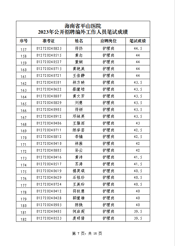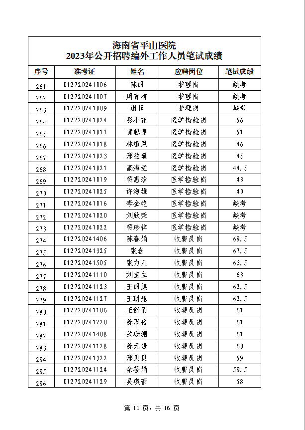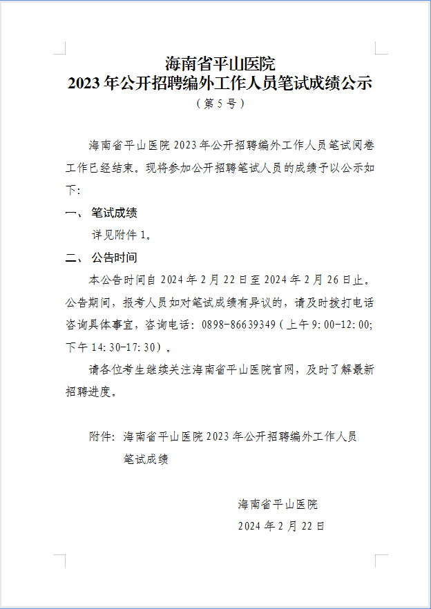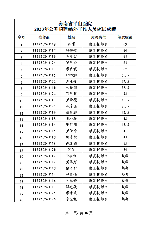 海南省平山医院 2023年公开招聘编外工作人员笔试成绩公示
