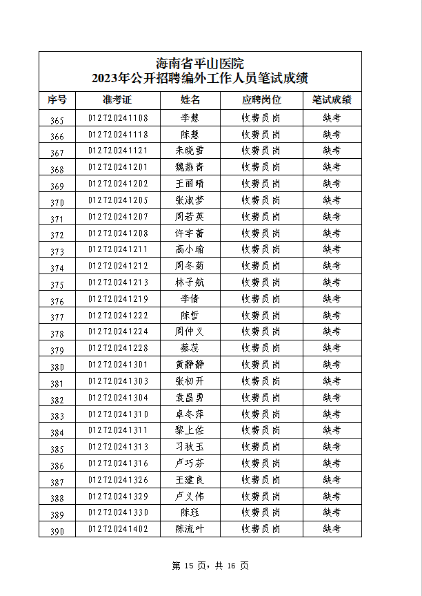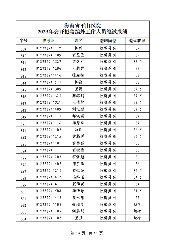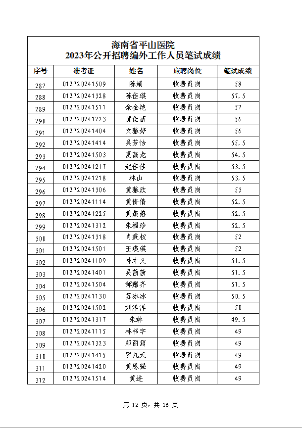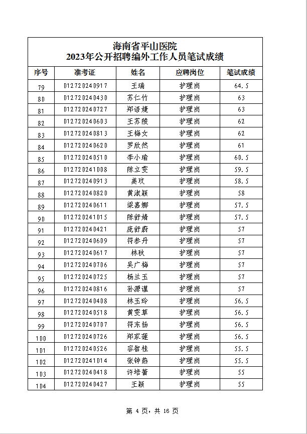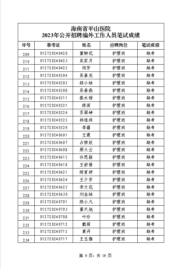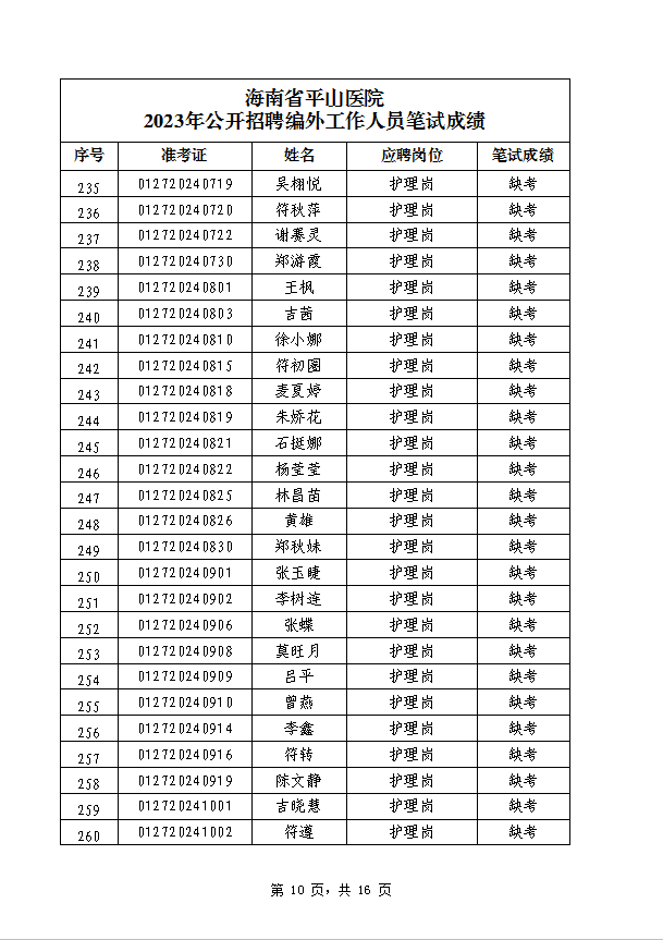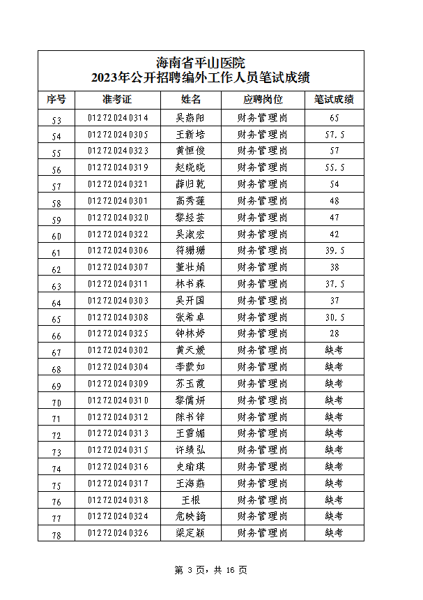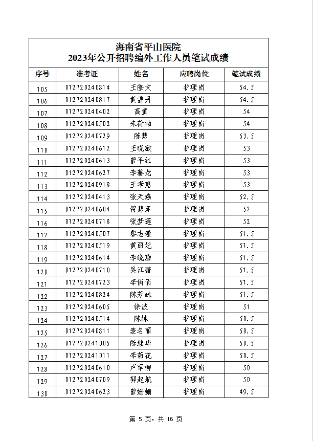 海南省平山医院 2023年公开招聘编外工作人员笔试成绩公示