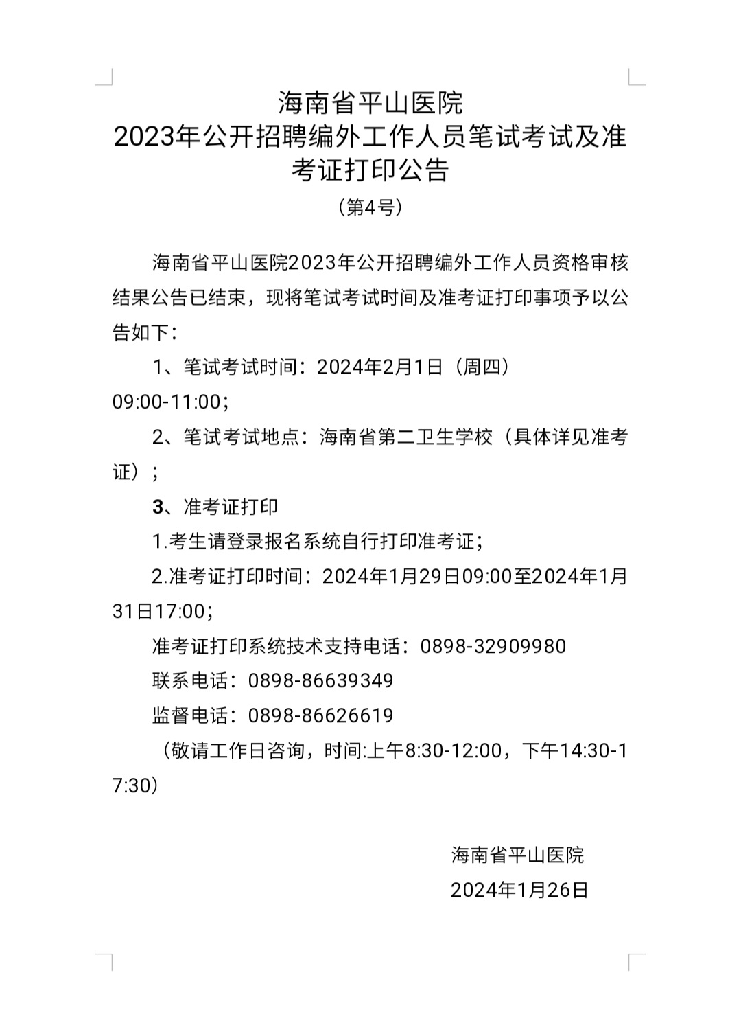 海南省平山医院2023年公开招聘编外工作人员笔试考试及准考证打印公告