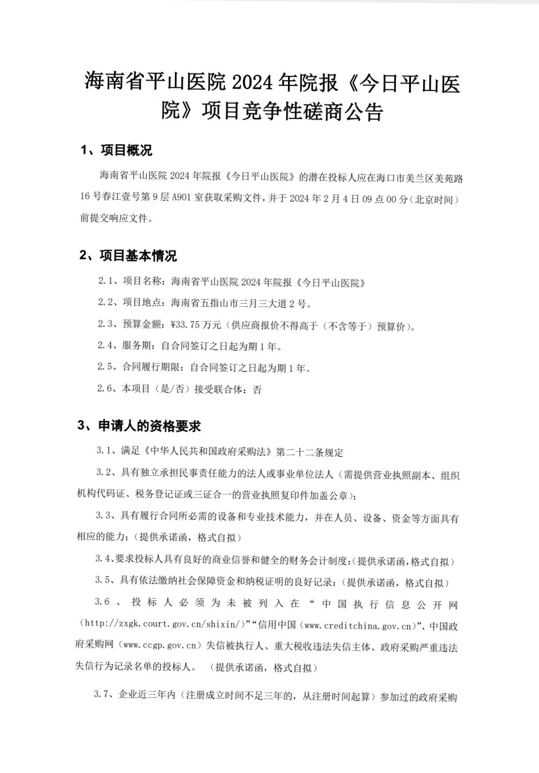 海南省平山医院2024年院报《今日平山医院》项目竞争性磋商公告