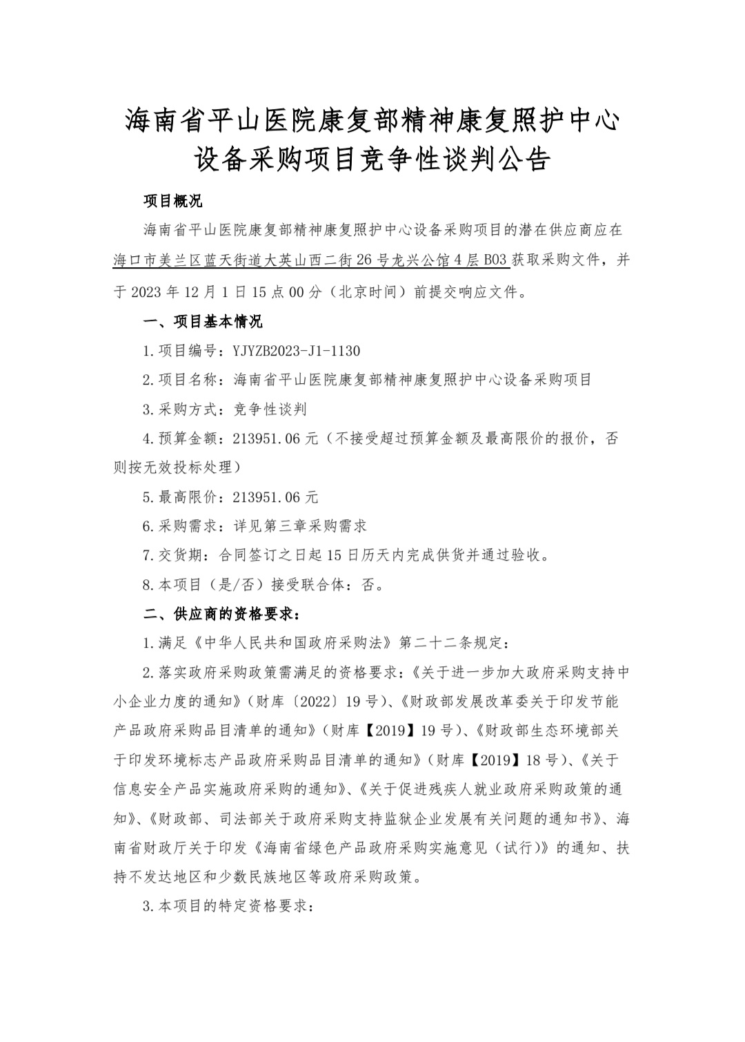 海南省平山医院康复部精神康复护照中心设备采购项目竞争性谈判公告