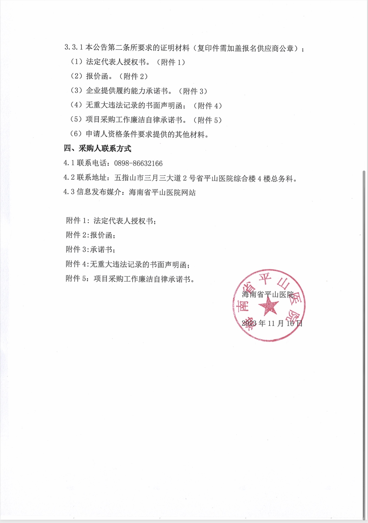 附件1法定代表人授权书 附件2报价函 附件3承诺书 附件4无重大违法记录的书面声明函 附件5项目采购工作廉洁自律承诺书 文章导航 上一篇:海南省平山医院外语标识标牌项目成交公告下一篇:海南省平山医院2023年社区康复设备设施采购项目(第二次)竞争性谈判公告