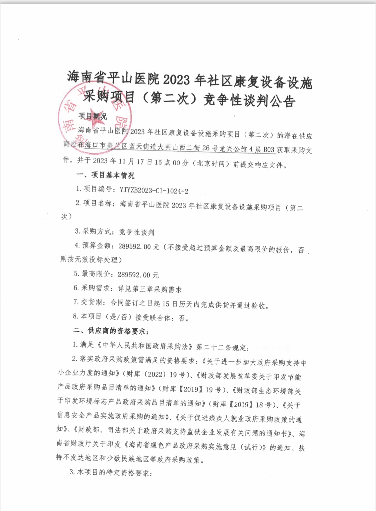 海南省平山医院2023年社区康复设备设施采购项目(第二次)竞争性谈判公告