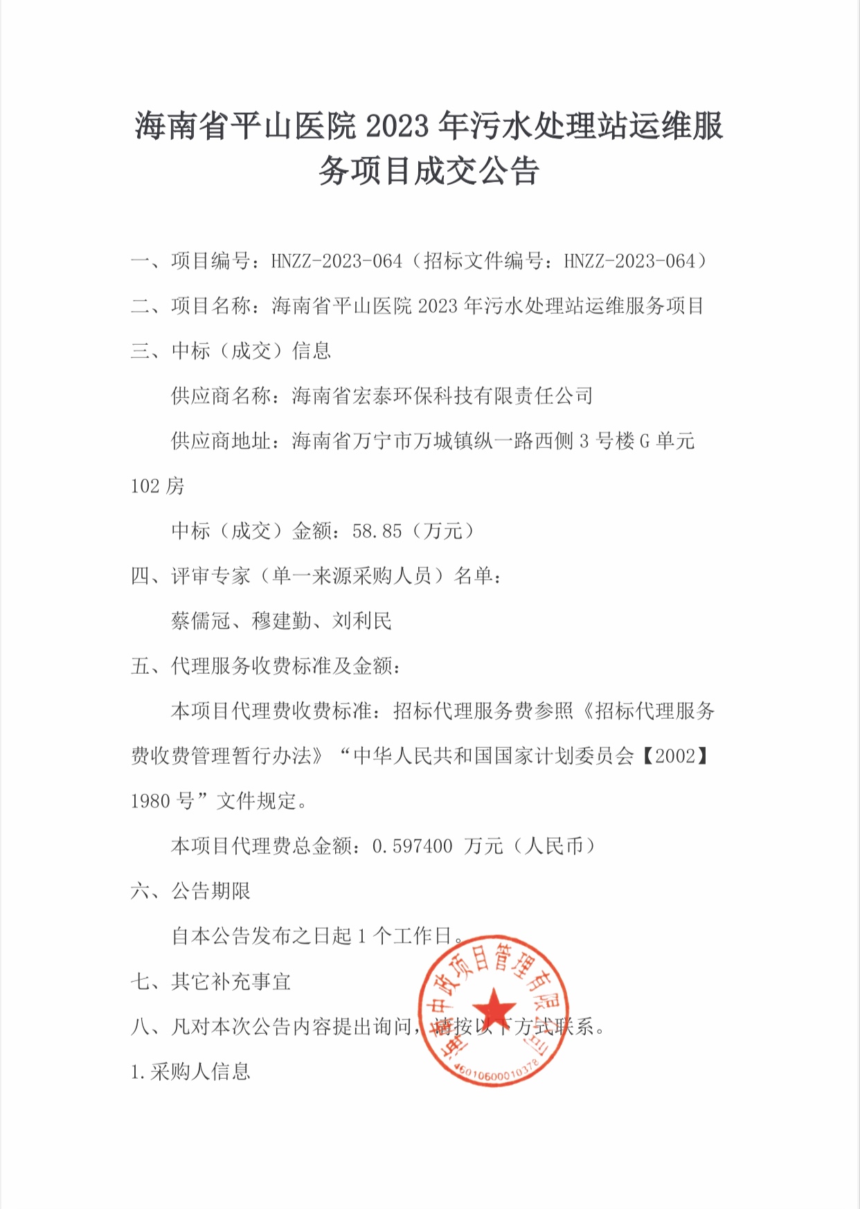 海南省平山医院2023年污水处理站运维服务项目成交公告