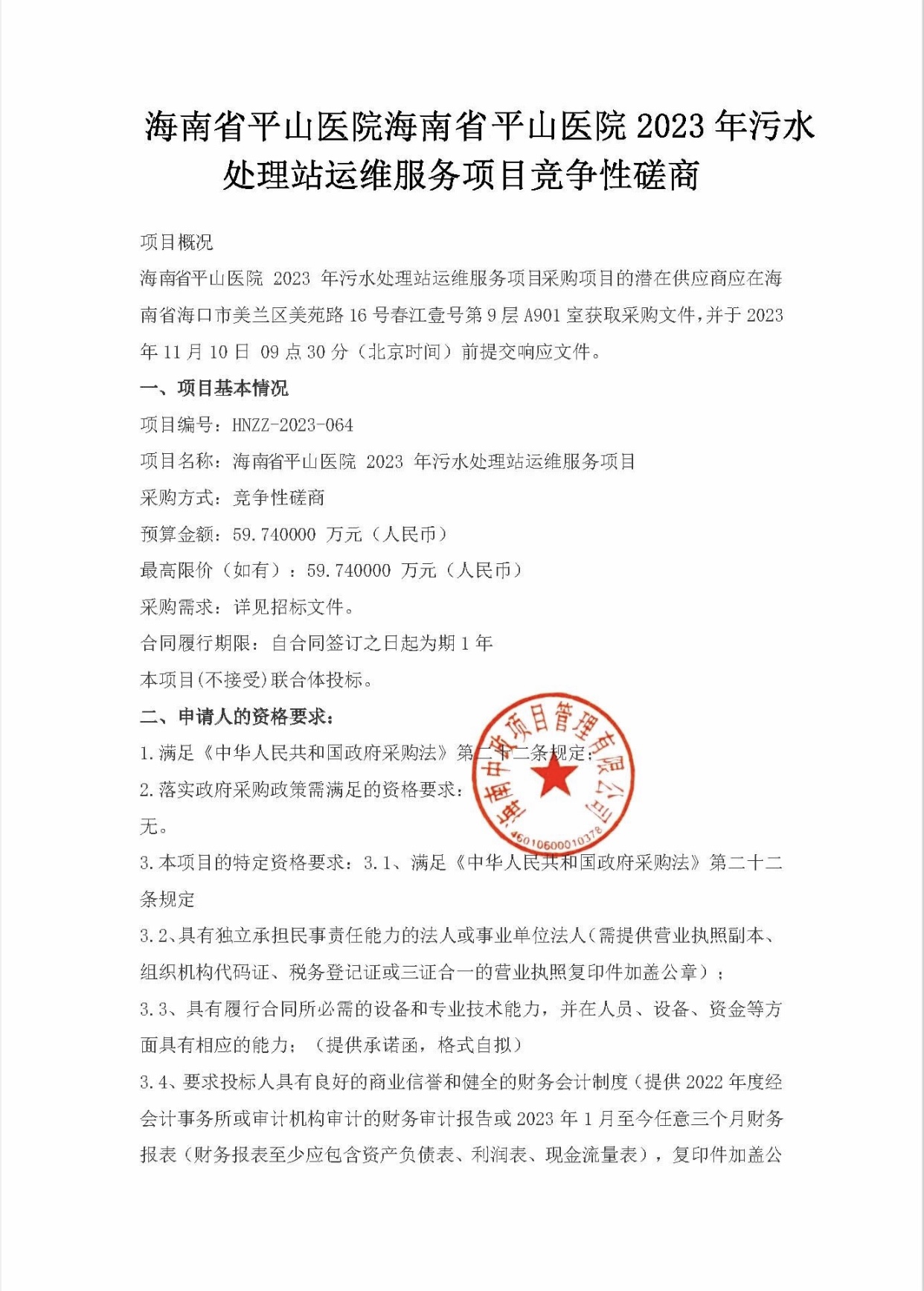 海南省平山医院海南平山医院2023年污水处理站运维服务项目竞争性磋商