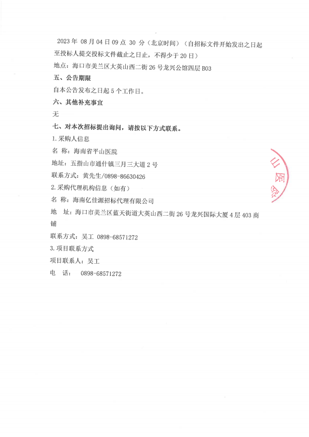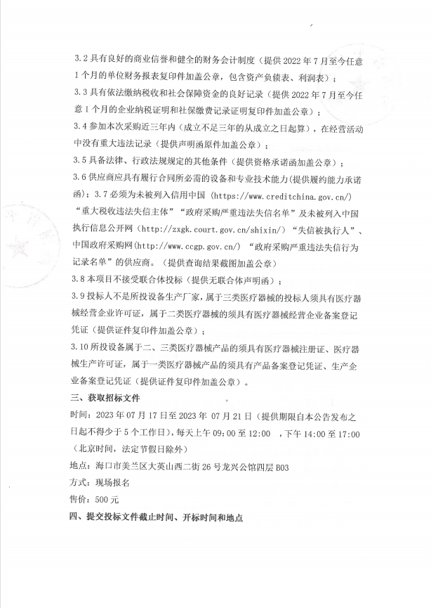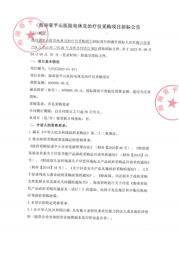 海南省平山医院电休克治疗仪采购项目招标公告