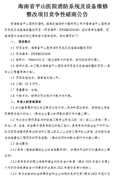 海南省平山医院消防系统及设备维修整改项目 竞争性磋商公告 文章导航 上一篇:海南省平山医院消防系统及设备维修整改项目成交结果公告下一篇:海南省平山医院2023年“省直医疗卫生机构设备购置”项目(二次采购)招标公告