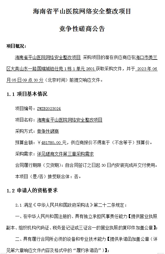 海南省平山医院网络安全整改项目竞争性磋商公告