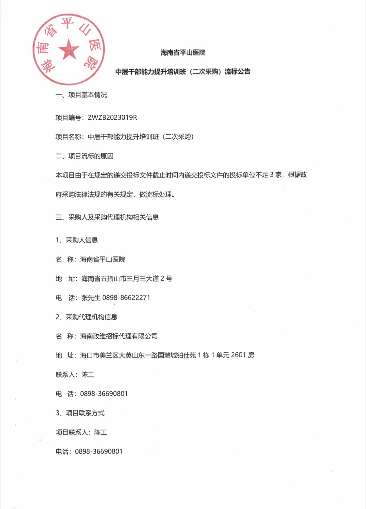 海南省平山医院 中层干部能力培训(二次采购)流标公告