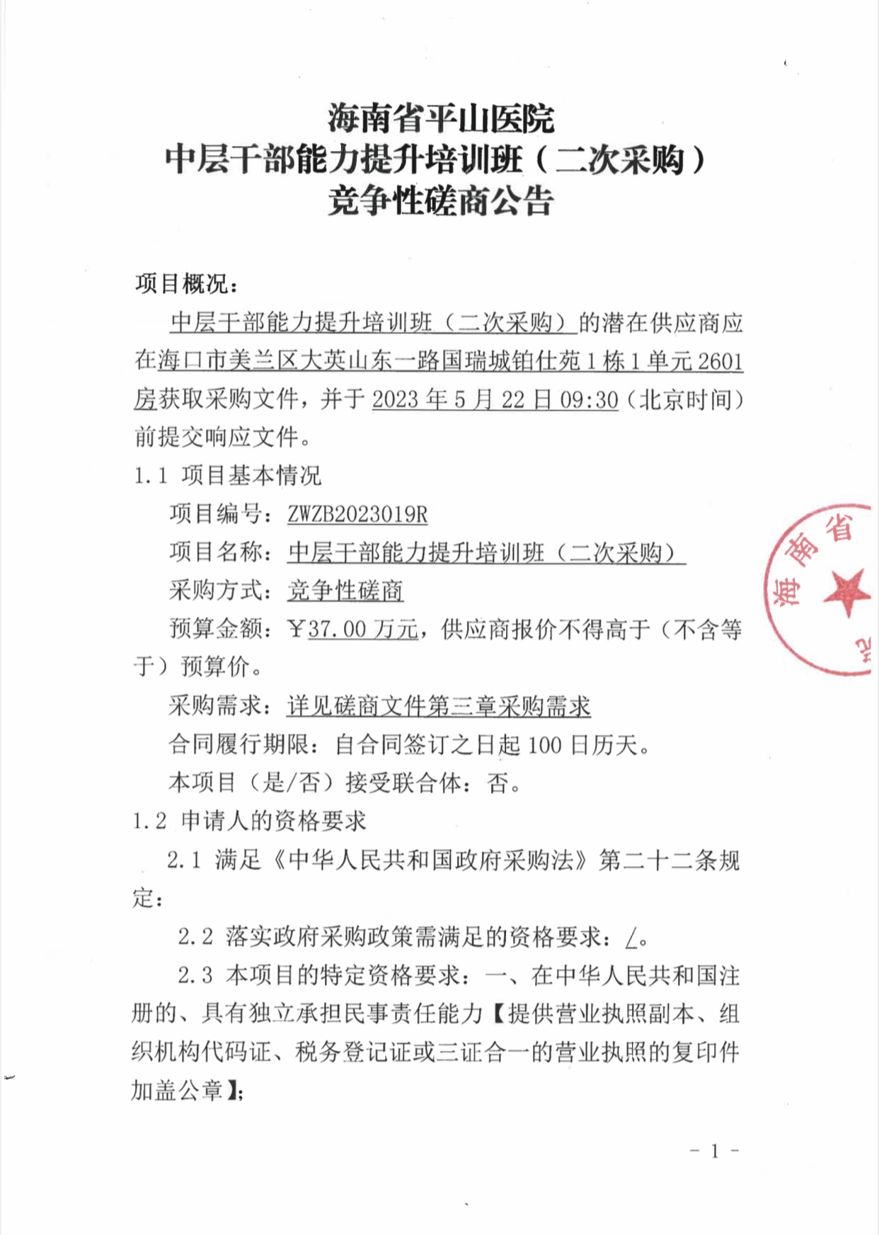 海南省平山医院 中层干部能力提升培训班(二次采购)竞争性磋商公告