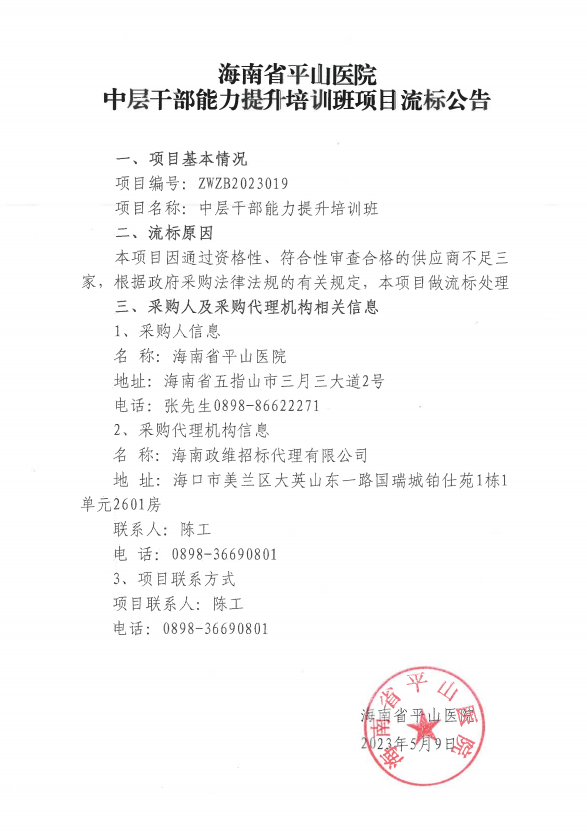 海南省平山医院 中层干部能力提升培训班项目流标公告