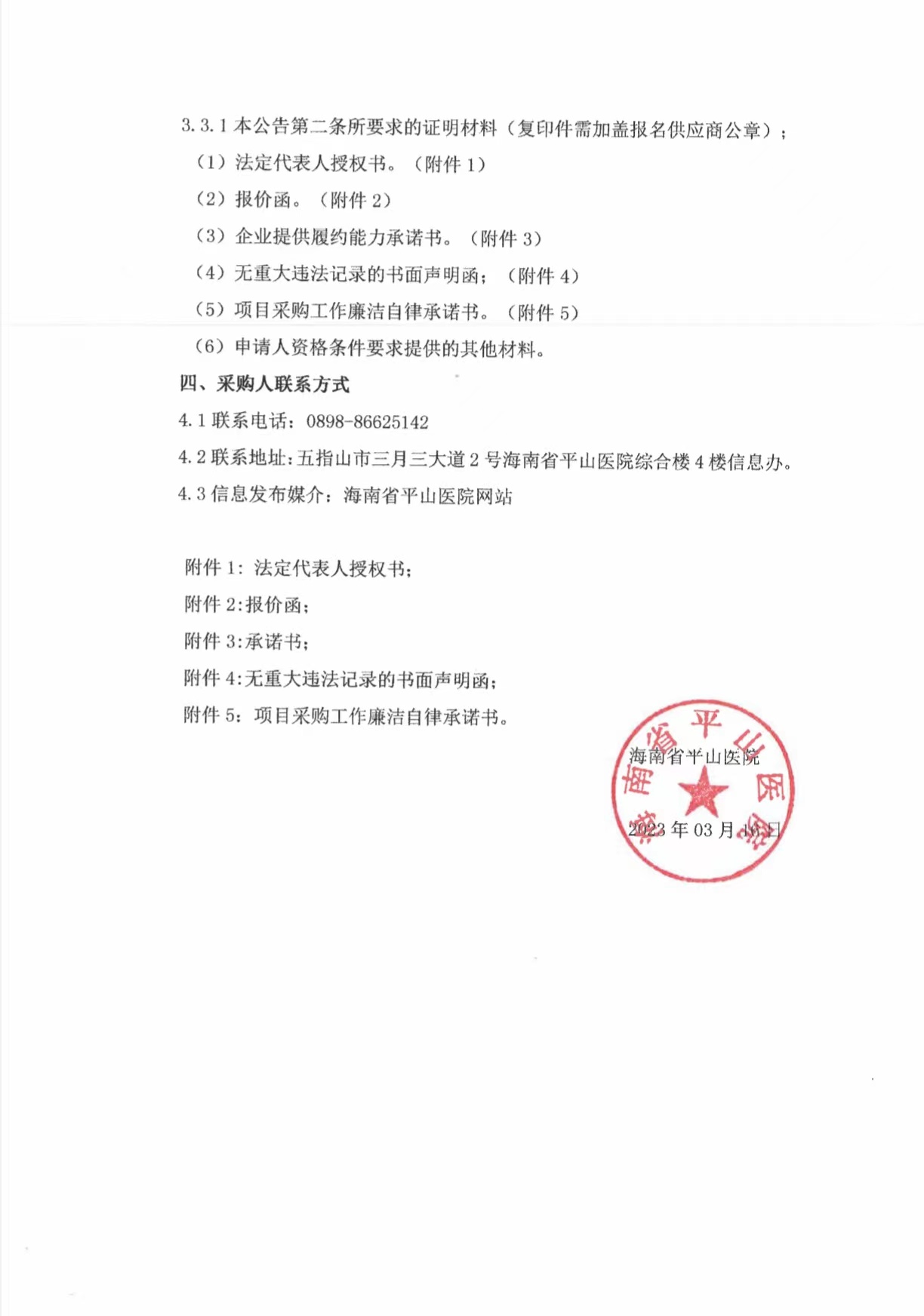 附件1法定代表人授权书 附件2报价函 附件3承诺书 附件4无重大违法记录的书面声明函 附件5项目采购工作廉洁自律承诺书 文章导航 上一篇:海南省平山医院帮扶什会村委会新建光伏路面硬化项目公告下一篇:海南省平山医院关于自主定价医疗服务项目及价格的公示