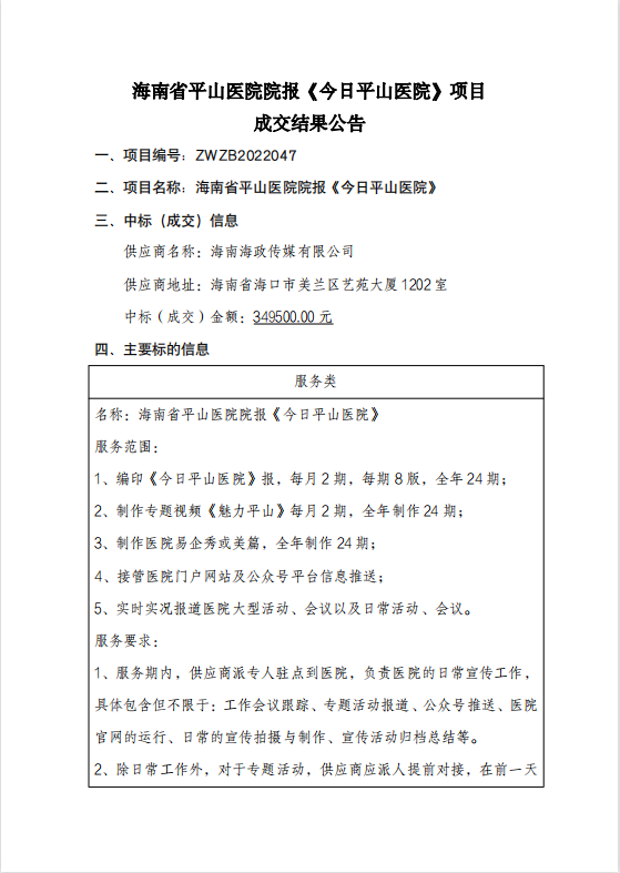 海南省平山医院院报《今日平山医院》项目成交结果公告